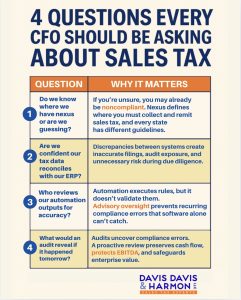 At Davis Davis & Harmon LLC – Sales Tax Experts, we help CFOs and PE-backed companies uncover these gaps before they hit cash flow, margins, or valuation.